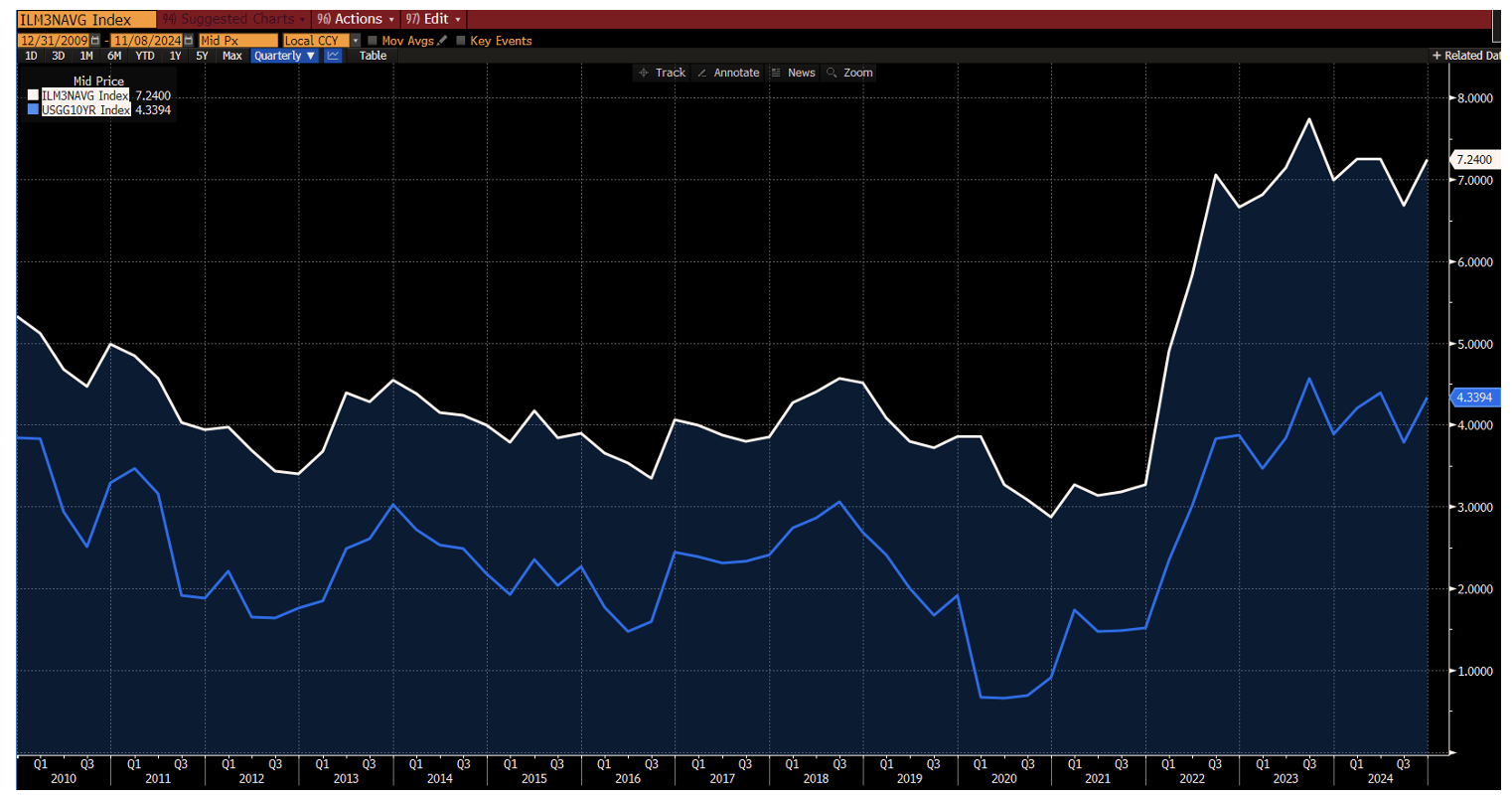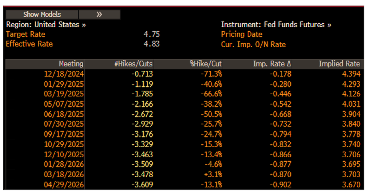 This would buy additional time to see what fiscal policies might be coming and could prove prudent (especially given the high likelihood of a unified U.S. government). Skipping a meeting would also slow down the current cadence of policy rate cuts which makes sense as you get closer to a neutral stopping point (which appears to be closer to 4% than 3% based on the recent data and market pricing).