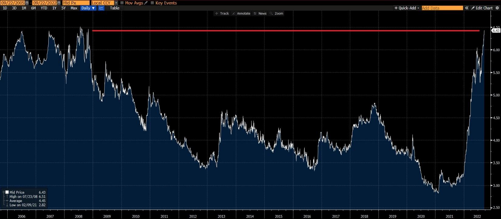 Source: Bloomberg, LP; highlighting Bankrate.com US home mortgage 30 year fixed national average at 6.43%, highest since 2008; data as of 9.22.22