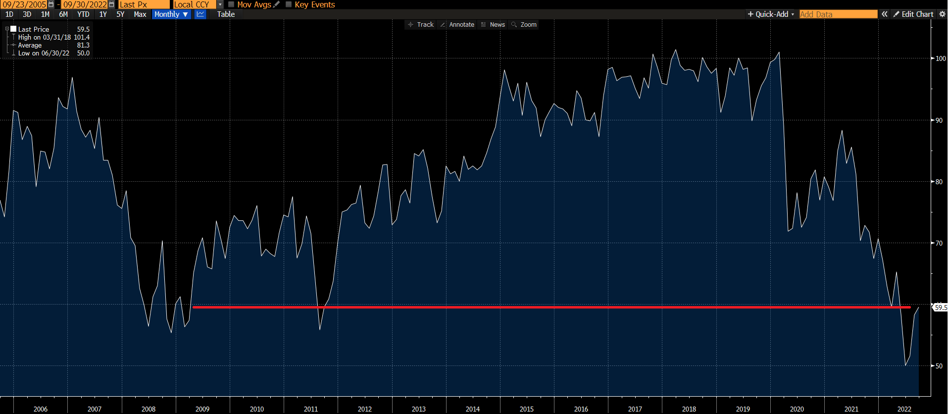 Source: Bloomberg, LP; highlighting University of Michigan Consumer Sentiment Index reading in range of 2008 (Great Financial Crisis) and 2011 (S&P downgrade of US debt); data as of 9.16.22