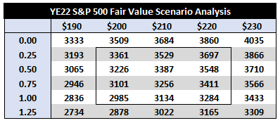 One could infer from the chart above that the equity multiple has further to fall, but let’s assume real interest rates eventually reverse course and drop from here…a likely scenario, says Jefferies Trading Desk, if 2023 EPS were to be revised to the $190-$230 level. In that case, 15x equity multiple x $200 2023 EPS = S&P 500 3,000, 19% lower than 9/23 levels. Stated in terms of the 10yr real rate, this is what a pricing matrix could look like (note: with the current 10yr real rate at 1.3%, we would equate the 1.25% scenario below as roughly equivalent to a 15x equity multiple):