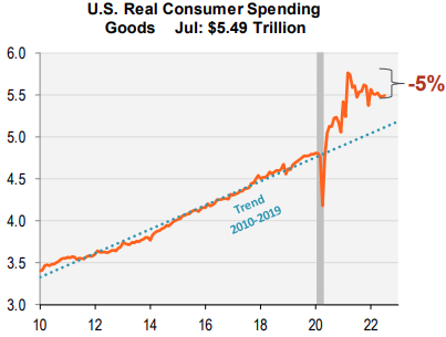 Coming into 2022, there were multiple reasons to be positive on the state of the consumer: healthy household balance sheets, robust savings accounts buoyed by pandemic stimulus, all-time highs in equity and housing markets, and low unemployment. Most of those positives have slowly (or in some cases, quickly) waned. After a violent jump in real (inflation-adjusted) consumer spending, we’re witnessing a move back toward trend.