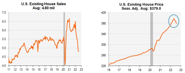 The Sept 21 reading on single-family existing home sales sank to just 4.28 million, the weakest since Nov 2015 – they are now down 28% from the pandemic peak. The primary culprit is affordability fueled by rising mortgage rates, which recently touched levels not seen since 2008.