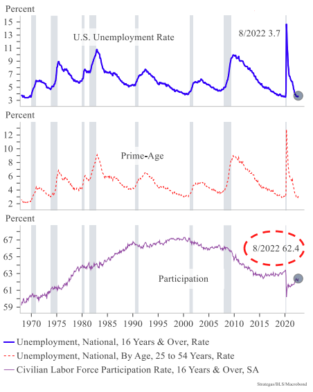 The current employment picture can be described as none other than robust. Not only is unemployment low, but job openings remain high. According to Strategas, there remain roughly 11 million job openings against 6 million unemployed. Part of that mismatch is due to a decades-low labor participation rate, fueled by an aging demographic and lifestyle trends which were altered during the COVID lockdowns.