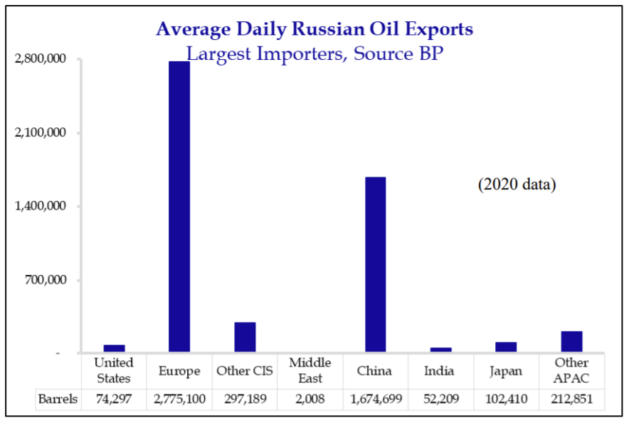 It is difficult to understate the importance of Russian oil, not only to western Europe, but to the world. According to the February 2022 OPEC Monthly Oil Market Report, Russia is the second largest global producer of oil at 9.95 million barrels per day (MBls/d), behind the US at 11.75 Mbls/d with Saudi Arabia a near tie at 9.87 Mbls/d (Nov. 2021 production numbers). To further put this in context, Russia’s share represents right at 10% of global supply. However, unlike the US, which consumes far more oil that it produces, Russia is a large net exporter, meaning that the majority of that nearly ten million barrels of oil each day is being consumed by other parts of the world. The primary beneficiary is Europe, although some of that oil makes it over to the US as well (7% of total November 2021 crude imports to be exact, per the US Energy Information Administration).