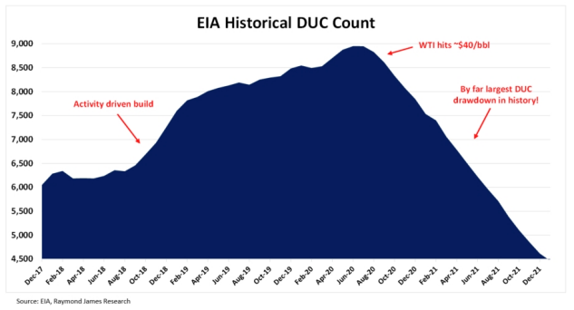 This has resulted in free cash flow generation not seen from the energy sector since 2008. Not only are oil prices high, but companies have become much more efficient operators than they were ten or even five years ago. With that said, this level of underinvestment can’t continue. The primary means by which domestic producers have been able to maintain this level of hydrocarbon output while keeping expenditures in check is that they’ve been drawing on an inventory of discounted flows known as the DUC (drilled-uncompleted) well count. This represents those wells that have been drilled to total depth but not yet fracked and put on production. At any given time, there must be some level of DUC inventory due to the fact that operators often complete several wells in a row to utilize frac fleet efficiency. And during times of lower oil prices (like much of 2015 – 2020), operators are incentivized to drill wells (to utilize long-term drill rig contracts) but hold-off completion until prices improve. Right now, we’re seeing the opposite – DUC’s are being drawn down at a record rate in order to increase production without spending as much money.