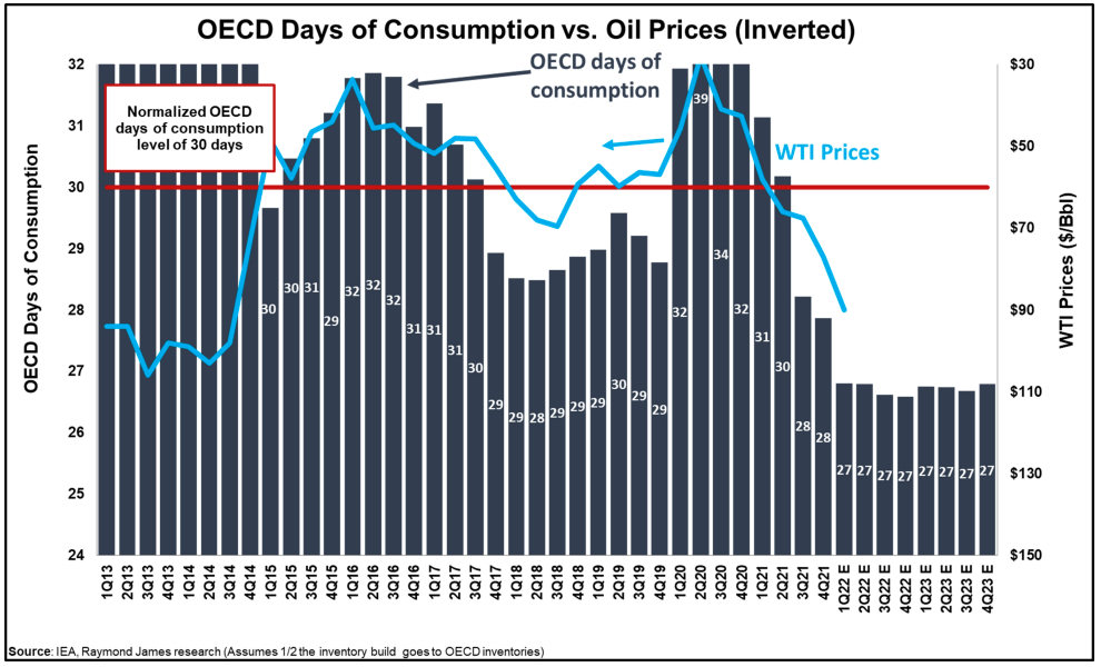 Since that time, the outlook has tightened considerably. The IEA has increased its 2022 demand forecast by 900,000 bls/d, citing a milder-then-expected negative impact from the Omicron variant and a weather-driven switch to oil from gas for residential heating and industrial needs. Moreover, while OPEC+ has continued its pledge of adding 400,000 bls/d per month through September 2022 (the gradual rolling-off of COVID-era cuts), they have repeatedly fallen short of that mark due to several member nation’s inability to ramp production from existing capacity. Regarding that point, the IEA noted that unless OPEC+ member nations with spare capacity (namely Saudi, Iraq and UAE) make up for the production deficits of the broader group (namely Angola and Nigeria), the total amount of oil lost in 2022 could approach one billion barrels! The COVID pandemic not only drove oil prices lower than we’ve seen in years, it disincentivized investment in new production, which has now become apparent even in those countries that were believed to have ample ready inventory.