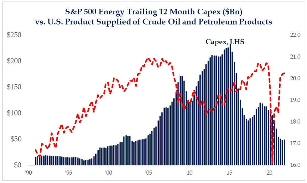 In terms of energy markets, the conflict between Russia and Ukraine is currently getting all the attention. But as we’ve discussed, there are fundamental issues at work which give us cause to be an oil bull long past the (hopefully soon) conclusion of this war. As COVID reaches the endemic phase, oil demand has come roaring back and is forecasted to surpass its 2019 highs this year². At the same time, we think the chronic underinvestment in oil supply both domestically and internationally has created a situation where demand can’t easily be met in the near-term, at least not in a meaningful way as to build the inventory depletion of the last year. As a result, we remain bullish on oil price and the companies that produce it. We have been overweight energy in our Compounders stock sleeve since the beginning of September 2021 and we seek to maintain that position.