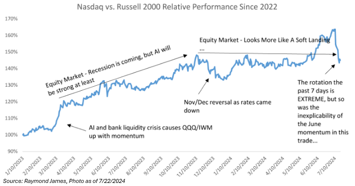 What Has Happened: Since the recent June CPI report and the June Presidential debate, small caps and the average stock have had an extreme run. More importantly, technology stocks (or tech-proxies) have been the funding mechanism. The rationale is three-fold: