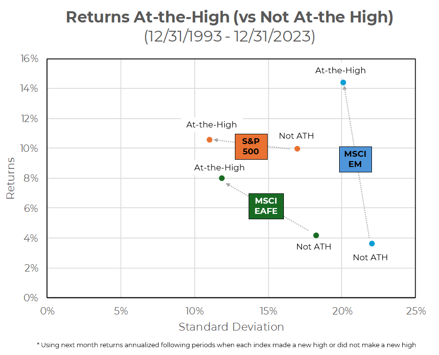 “Contrary to common concerns, approaching or hitting new all-time highs in the equity markets may not be the harbinger of impending downturns that some perceive. In fact, historical data reveals an intriguing trend: stock markets around the globe have generally exhibited stronger performance and lower risk when scaling new heights.”