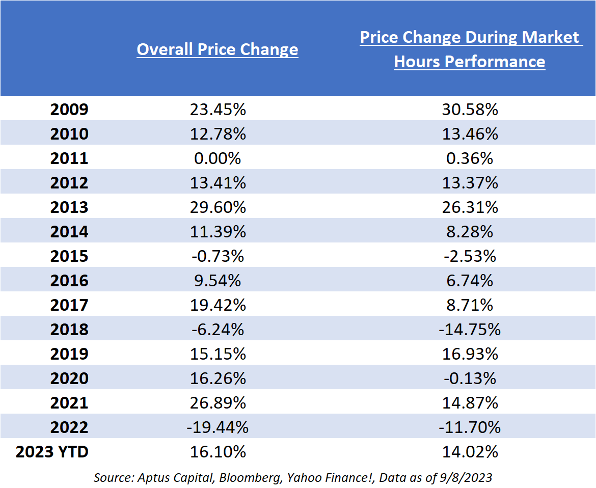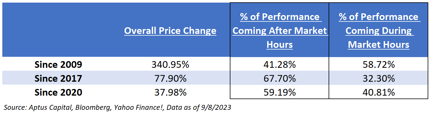 Most of the gains over the past few years look to have come when the market was closed but going back to 2009, the data shows the majority of gains have come during market hours.