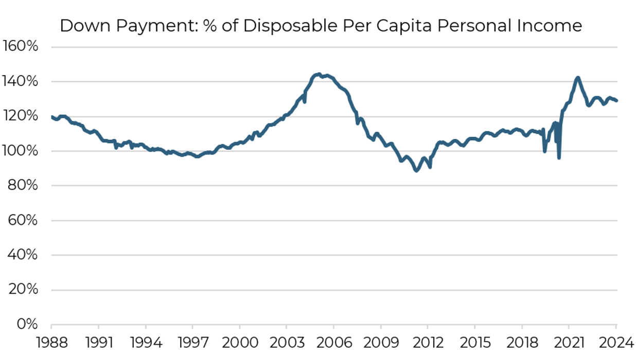 Home prices have gained a reputation for being “too high” in recent years, but a closer look suggests that, in income terms, they align with historical patterns. Down payments, which move directly with home prices, have moved higher in both nominal and real (inflation-adjusted) terms, but remain reasonably in line with long-term trends as a percentage of disposable income.