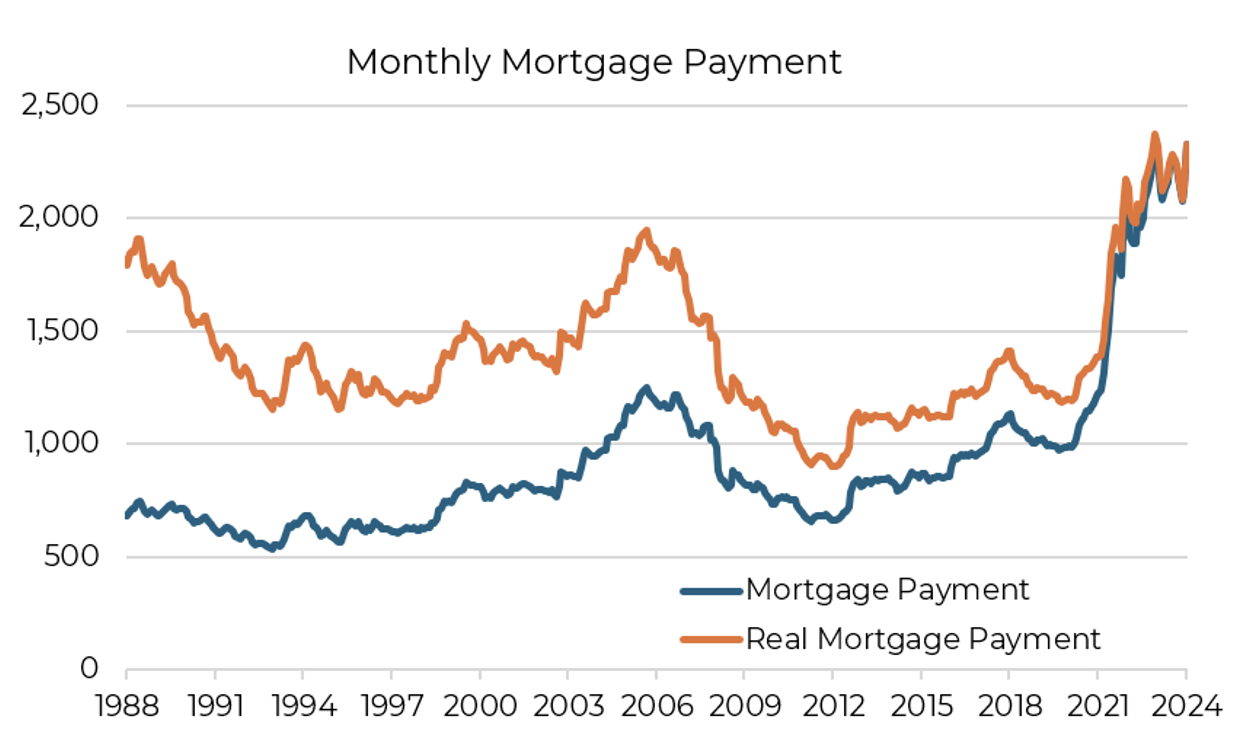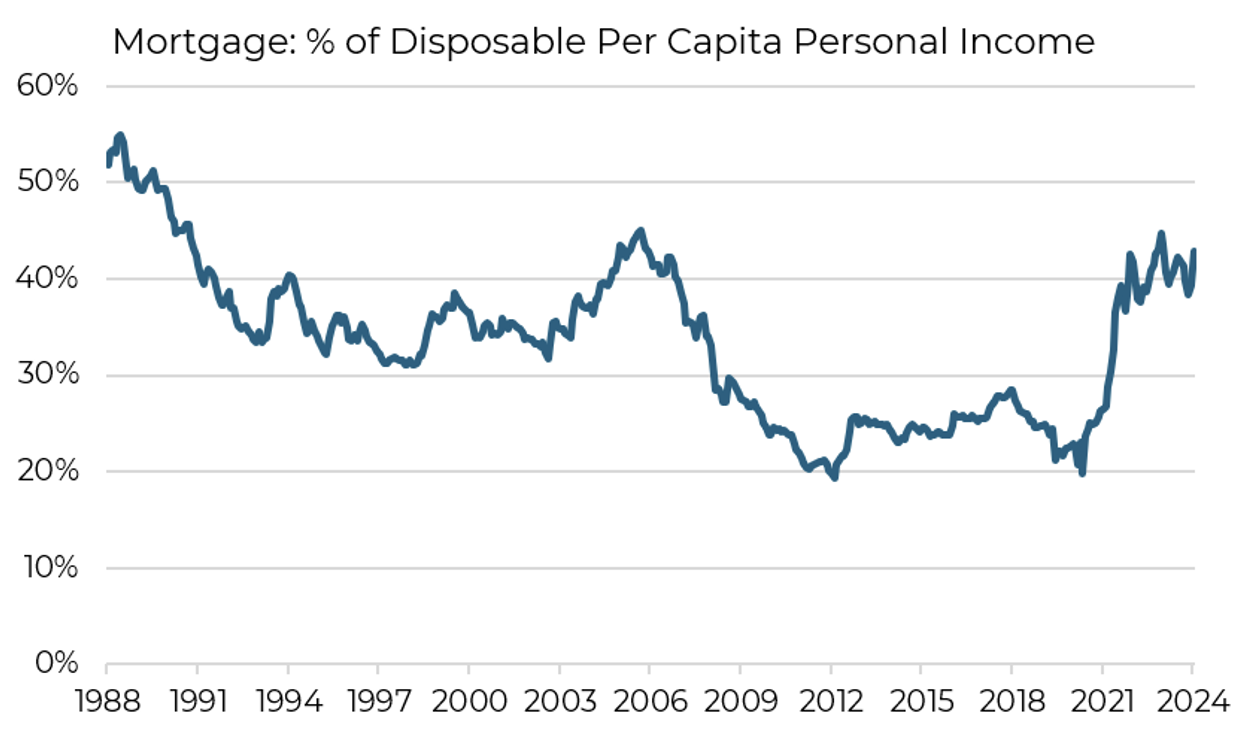 The real affordability strain today comes from mortgage payments. With interest rates previously sitting below 3%, mortgage payments were at historic lows in real terms. With rates in the 7% range, monthly costs have more than doubled in just a few years, relative to disposable income. Surprisingly, mortgage payments relative to income are only back to mid-2000s levels, highlighting how affordable housing was following the global financial crisis.