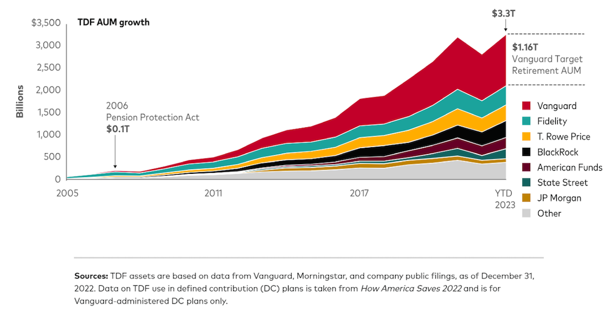 What on Earth does the Pension Protection Act of 2006 have to do with all of this? The legislation is important because it brought sweeping reforms to the defined contribution retirement system. In particular, it made Target Date Retirement funds the Qualified Default Investment Alternative (QDIA) in defined contribution plans. Prior to the act, cash was the default investment unless the participant selected another fund for ongoing contributions. Along with other reforms that incentivized plan sponsors to abandon active investment options in favor of passive, low-fee investments, unsurprisingly we have seen an absolute explosion in TDF AUM.