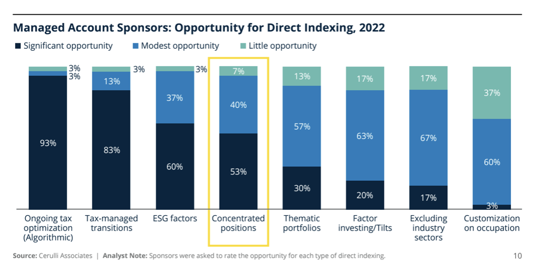 A direct indexing strategy offers control over realized gains and losses that an active manager of an SMA or mutual fund strategy cannot provide. Bottom line, direct indexing has been an excellent innovation for investors who need to think about achieving their return objectives in as tax-efficient a manner as possible. Below is a helpful graphic from Cerulli that provides some insights on where sponsors see opportunities to apply the approach.
