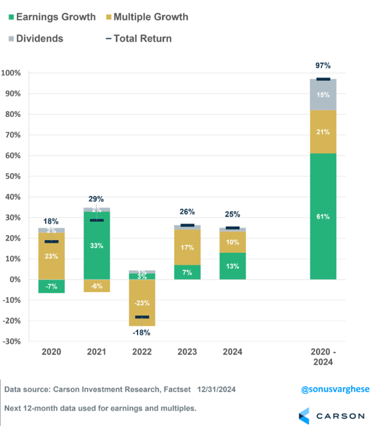 Joseph: Expanded valuations have played a role, but earnings growth has contributed a large portion of the fuel behind the gains of recent years
