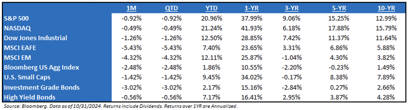 Market Recap – October 2024: Broad markets were down during October, but that should not be a surprise to investors, as it tends to be the worst month in an election year. But, on the flipside, what also shouldn’t surprise investors is that there tends to be strength in November, as this is the best month of an election year. Even taking it a step further, the three-month period from November through January has traditionally been the strongest three months for the market. On the fixed income side, bonds performed poorly as rates rose across the board, as the market has begun pricing in a positive term premium, as deficit spending continues to be the playbook for both candidates. The noticeable trend continues to be that bonds and stocks are positively correlated, and that fixed income may not provide insulation during periods of volatility. For example, in October, bonds were down -2.48%, while stocks were only down -0.92%.