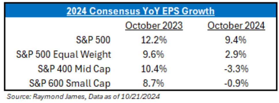 But the broadening is more of a narrative than a fundamental reality at this point. No investor would argue that the market has not been in a bull rally over the past year, but it hasn’t been a bull market for EPS. As of today, it looks like Small- and Mid-Cap indices will have lower EPS YoY in 2024, and S&P 500 Equal Weight will only be up just slightly.