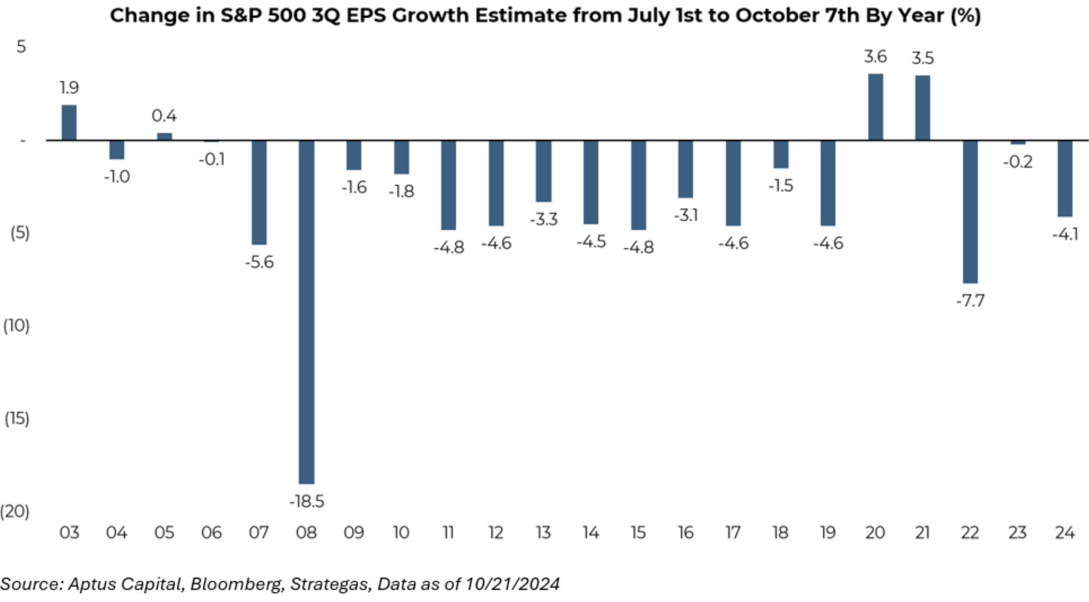 It’s no secret that earnings expectations come down throughout the year – that’s normal. And this quarter is no exception. The 3rd quarter earnings growth estimate on July 1st was 7.2% and today sits at 3.1% for a growth revision of -4.1%. While this is concerning, it is by no means extreme relative to the last 20 years. In fact, the median growth revision is negative -3.2% over the past 20 years.
