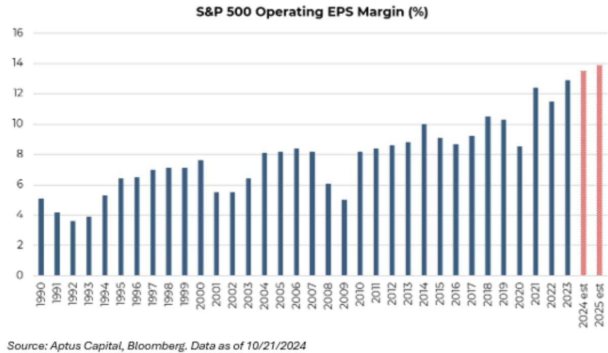 This is where investors should be focusing their attention. If someone dissects the 15% EPS growth for 2025, they’ll realize that 5% is coming from top-line (revenue) growth and that the remainder (10%) is coming from margin expansion. In fact, if this margin profile is achieved, it will be one of the highest margin profiles for the S&P 500 ever. This fact alone makes people question the earnings growth. But, the large-cap domestic market of today is very different from 40 years ago. The market is more of an operating leverage juggernaut. Said another way, the market can see economies of scale on earnings growth if revenue growth remains healthy and that one input of revenue growth will create > 1 input of earnings growth.