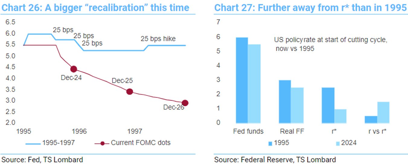 The big difference comparing 1995 to today is that the current Fed thinks it is much further from the neutral rate. FOMC commentary puts nominal r* in the 2½-3% range, which is more than 200bps below the current policy rate. In contrast, the Greenspan-led in 1995 thought interest rates were just 75bps above neutral, which matched the depth of their eventual cutting cycle. Given the bias in how today’s FOMC views its policy stance, it is likely that officials will cut interest rates faster – and by more – than the Greenspan Fed.