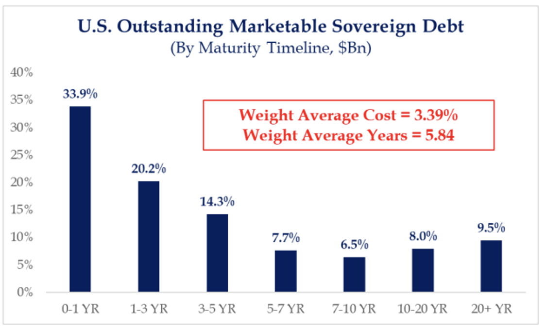 A whopping 34% of America’s outstanding debt matures in the next year, more than 54% in the next three years. This is, again, a short-term strategy designed to hide the longer-term economic consequences of running serial budget deficits equivalent to 7% of GDP and puts the American taxpayer at great risk in the long term.