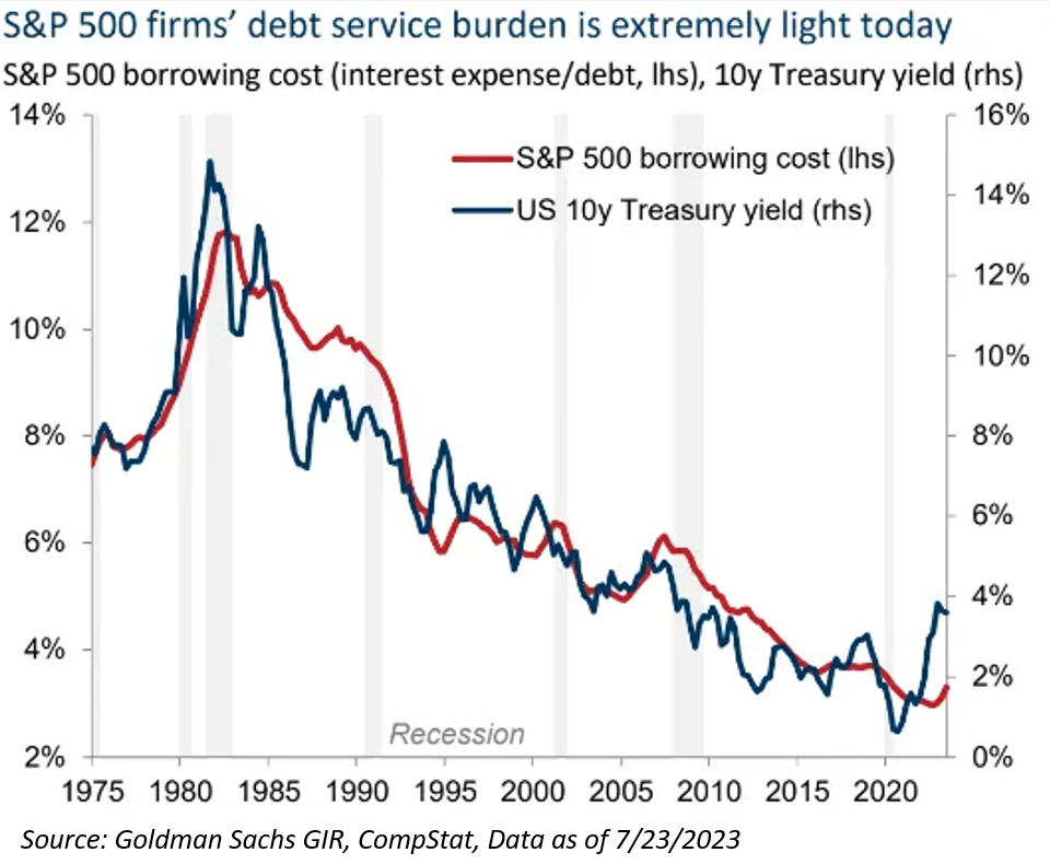 But not only does it help offset wage gains, its starting to help offset higher interest expenses. Originally, the inclination of higher rates on corporate debt was that it was going to degrade profitability. Currently, S&P firms are paying around 3% on debt while treasuries are yielding 4%. Below is a great illustration of the incredible lags that have been created via ZIRP post GFC.