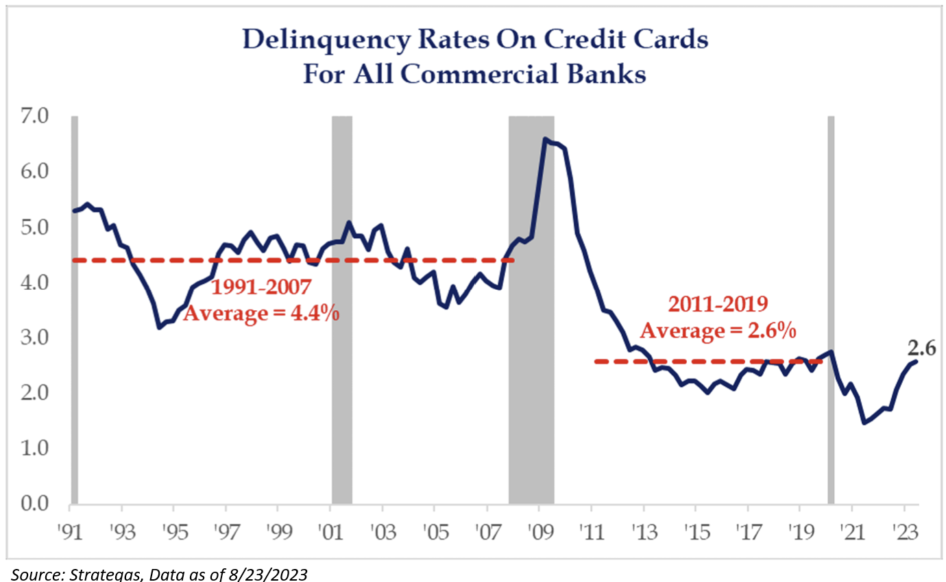 Given Macy’s earnings announcement the other day, which saw an increase in credit card delinquencies, consumers could be affected by their credit card rate increasing. Yet, consumer credit remains strong, but delinquencies are rising. However, looking at a broader set of data which was published by the Federal Reserve this past week shows that credit card delinquencies may simply be normalizing to pre-pandemic levels. At 2.6%, the latest reading is in line with the average for 2011-2019 but remains well below the 4.4% data average from 1991 to 2007.