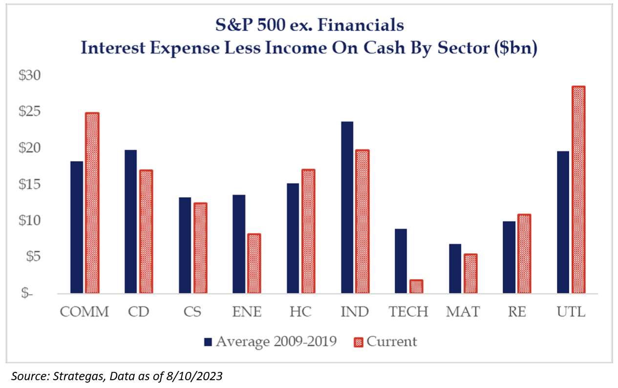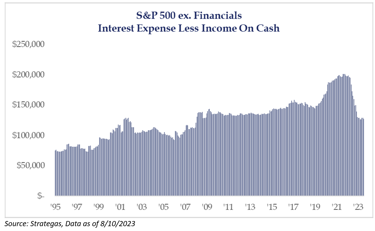 Said another way, looking at interest expense less the income generated on cash for the S&P 500 ex. Financials shows that the income generated on their cash has more than offset the higher interest costs.
