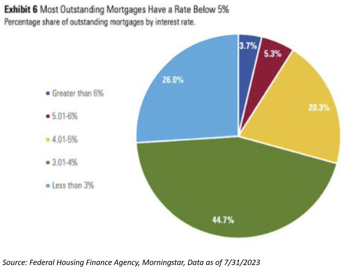 Simplistically speaking, where do rates affect consumers the most? Mortgage rates. Yet, if a person isn’t looking to buy a home, then they aren’t affected by rates. In fact, only 9% of all existing mortgages in the U.S. were taken out with a rate of above 6%, according to data from the Federal Housing Finance Agency. Moreso, 80% of the U.S. mortgages have a sub-5% rate. Basically, homeowners are locked in place by their mortgage’s “golden handcuffs”.