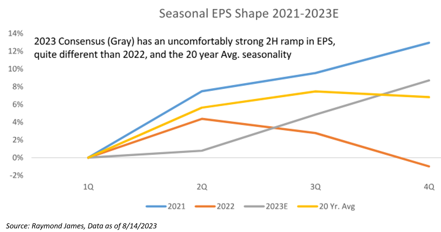The chart below shows the shape of seasonal EPS in the S&P 500 in 2021 (big recovery year), 2022 (slowing economy year) and 2023 (better-than-anticipated), which so far has seen worse EPS seasonality in Q2, but consensus shows a rebound in Q3/Q4, unlike 2022, and more like 2021. The 2H ramp is still alive and well in consensus estimates. This sentiment has continued to drive the market higher.