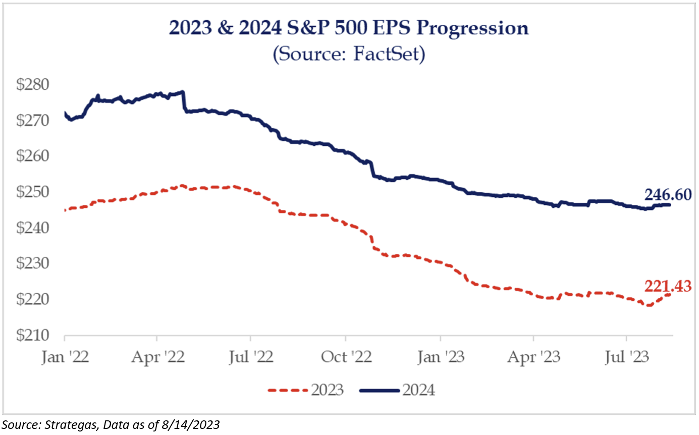 As it has been for the past five earnings seasons –and now that most of earnings season behind us– it is clear that EPS expectations have maintained better than most (including us) would have thought. Looking at sales growth, analysts expected -5.7% decline, while actual numbers only showed a decrease of -3.8%. The continued strength allowed 2023 EPS expectations to increase, approaching $221.50. However, 2024 remains unchanged over the past several weeks which is lowering the 2024 growth rate to 11.4%. This is still elevated relative to history and remains a challenge to achieve from our perspective but it’s still a long way away from recessionary type earnings numbers.