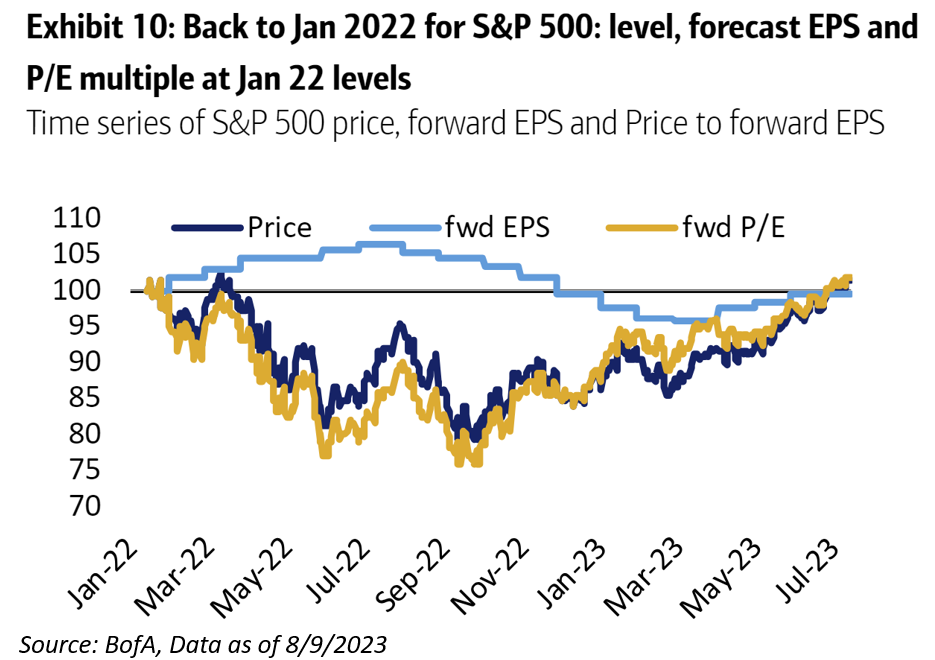 Overall, the S&P 500 has taken a roundtrip to January 2022 levels on forward earnings ($227 – next twelve months, not to be confused with ’23 expectations of $221.50) and on its multiple of 20x – a lost 18 months. But bonds and inflation have done a lot since then – the 10-yr yield jumped from 1.8% in Jan 2022 to 4.2%, real rates from -0.7% to 1.8% and Fed Funds saw the quickest ascent in history. Visibility on Fed policy, lower rates volatility, inflation cooling from 7% to 3%, and a pickup in GDP (+2.6% q/q SAAR vs. -1.6% in 1Q22) are all equity positive. And productivity gains (+3.7% YoY in Q2) could at least partially offset higher borrowing costs.
