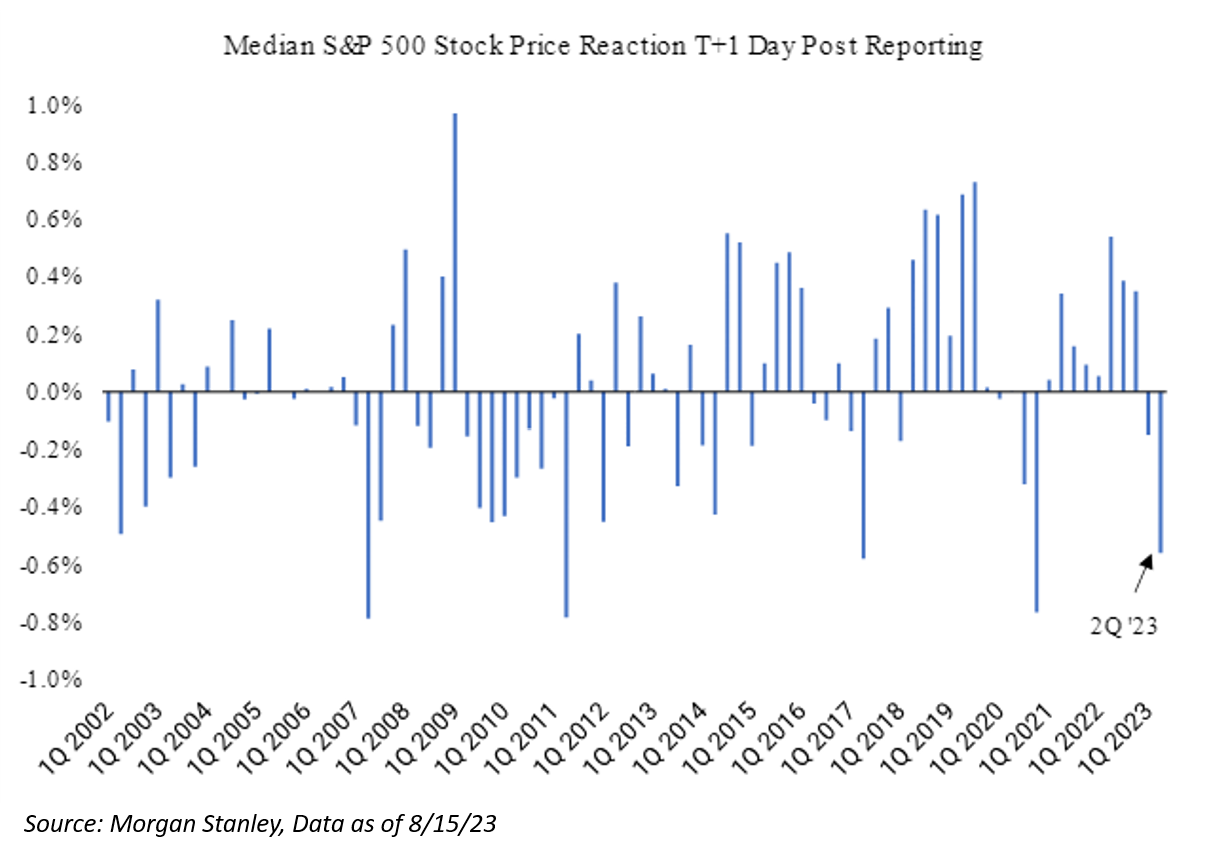 The biggest surprise to me has been the median T+1-day price change post reporting is -60bps, which is the lowest price reaction since 2020, and one of the lowest since the early 2000s. This is driven by a combination of negative price responses post both EPS beats and misses. However, the bigger outlier of the two outcomes from a performance standpoint appears to be the median price change post earnings beats, which is one of the lowest we’ve seen historically. This tells me that a lot of the positive sentiment is already priced into the market.