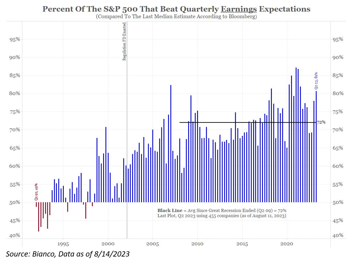 As it goes for the bottom line (earnings / net income) – close to 81% of companies beat on the bottom line. This is above the 72% average beat rate since the end of the Great Recession.