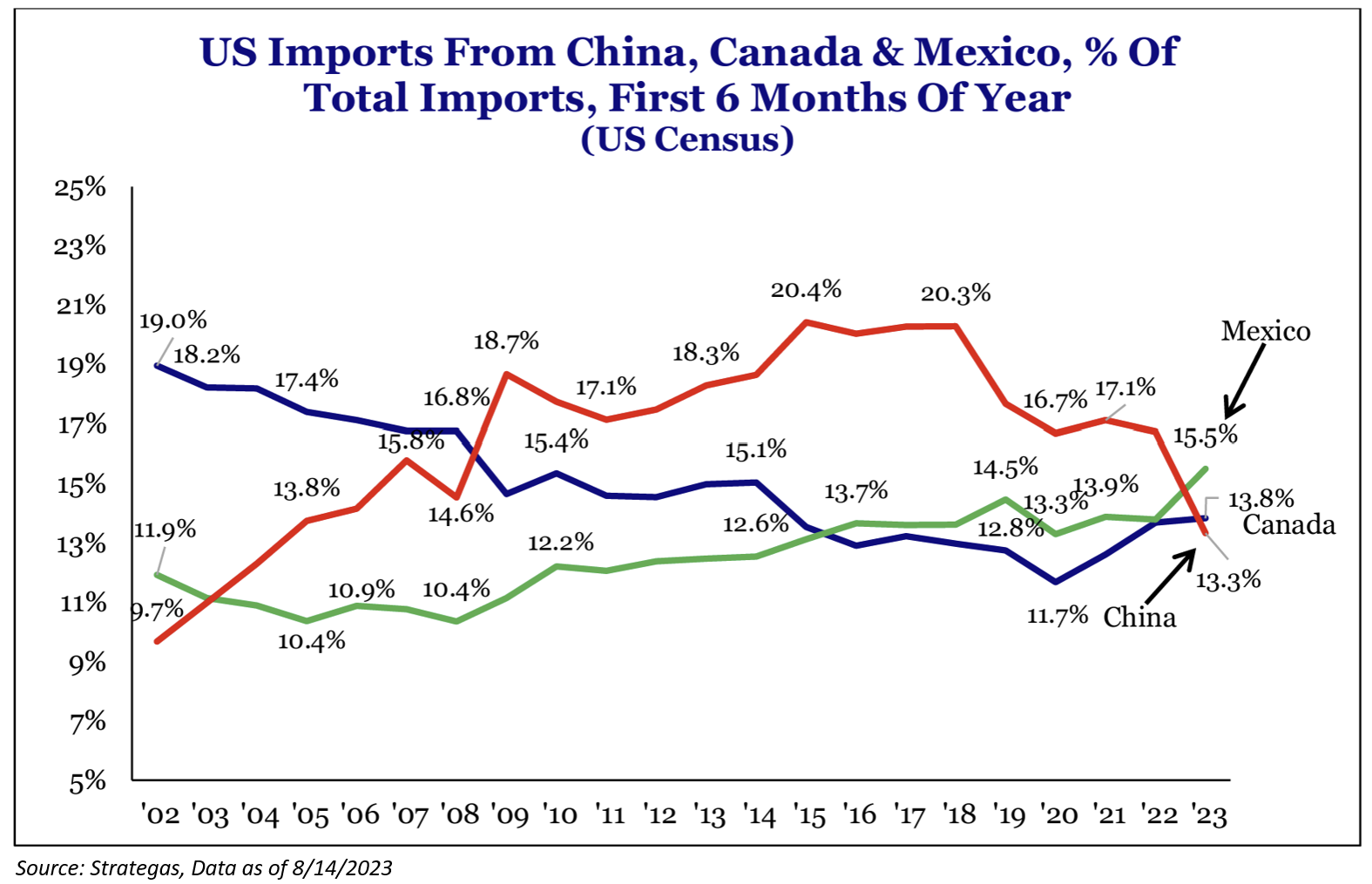 Last week, President Biden signed an executive order limiting US investments in China for advanced semiconductors, quantum computing, and Artificial Intelligence (AI) systems. While the executive order was narrow in scope, trade data released this week shows that a long-term shift away from China is underway, with US imports from China hitting their lowest level since 2004. In fact, trade with our neighbors (Canada and Mexico) is at its highest level since 2002.