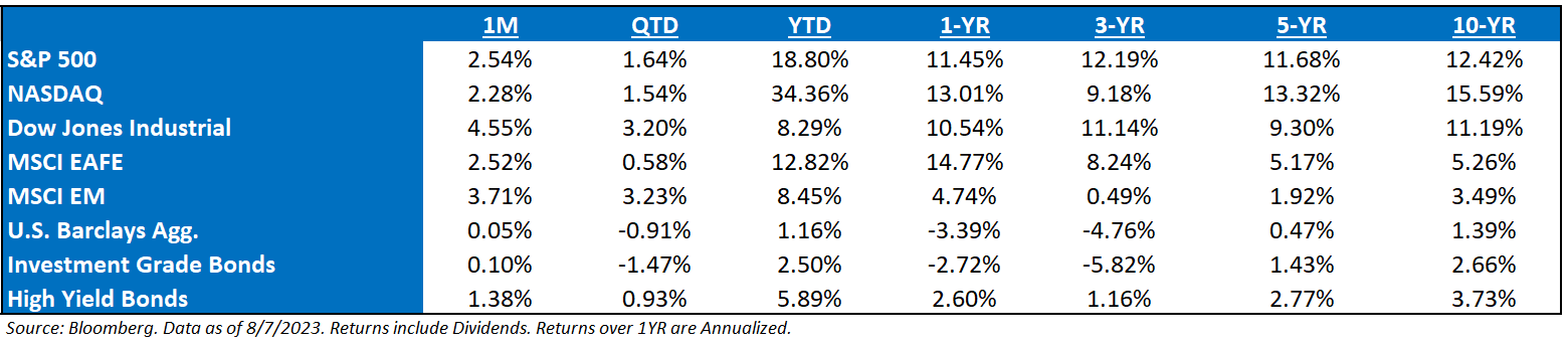 Here’s an updated table of Returns, as of Monday, August 7th: