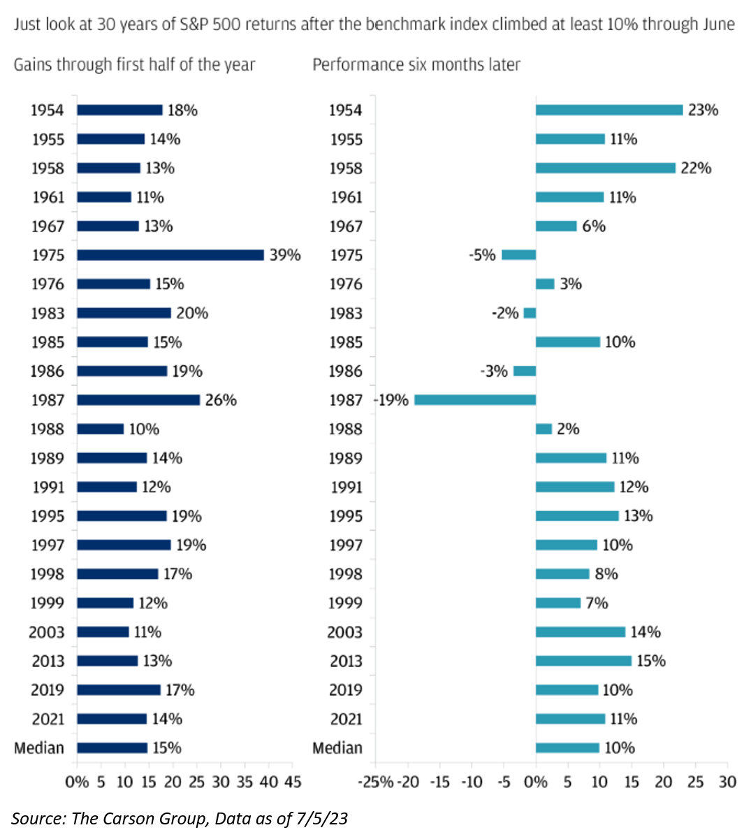 Think of the investor sentiment heading into this year… it was completely bearish. For example, just last fall, 100% of economists surveyed by Bloomberg forecasted that the U.S. would be in a recession within 12 months. Now, nine months later, we are still not in a recession and only 58% of economists surveyed think that a recession will occur in the near future. We can still spin that comment in a different way – a majority of the economists continue to believe that a recession is around the corner.
