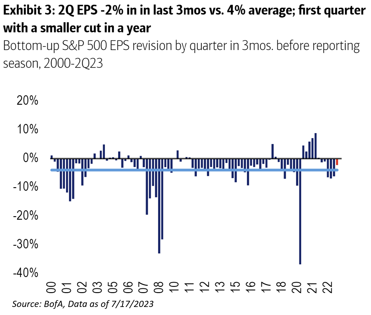 S&P 500 Q2 consensus EPS was cut by just 2% since March, half of the typical pre-season 4% cut, with the heftiest downward revisions in Energy and Materials. Expectations now stand at $52.88 (-8% YoY). The macro environment in Q2 was much stronger than expected heading into the quarter. Despite the banking scare in March, the economy proved to be more resilient, with incoming macro data topping consensus expectations by the biggest margin since Q3 2020 (per BofA). While banks are tightening, structural shortages (e.g. housing), ample liquidity from private markets, and lower sensitivity between earnings and credit post-GFC are pointing to some earnings resiliency – for the fifth straight quarter. The market has a recent track record of rallying during earnings.