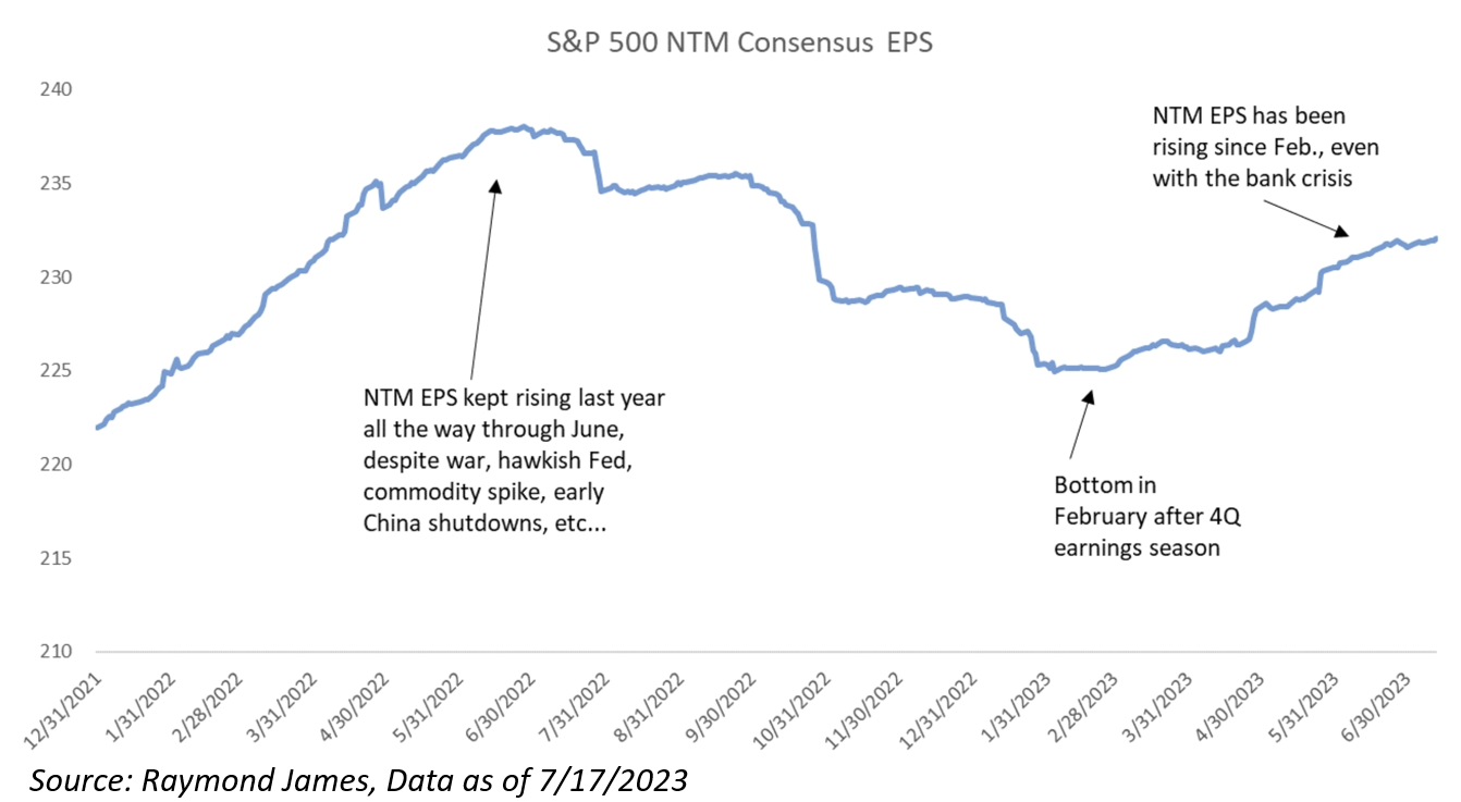 If you’ve read our stuff from the past year, you’d know that one of our themes for ’23 has been that inflation is going to transition to growth frustration. In a nutshell, these have been the two obstacles for the market to clear for more people to start believing in the market. First, inflation needs to be perceived to be coming back down to 2%. It feels as if we are getting there fast, barring a supply shock across the economy (if one excludes shelter from core CPI, y/y increase is only 2.6%). Earnings per share (EPS) expectations will become increasingly important to be able to keep the rally going. If you’re keeping score at home, we’ve been partially correct – the market has stopped worrying about inflation and has started focusing on earnings but the direction of earnings hasn’t happened yet. However, remember perspective; we are only one quarter in on the ’23 expectations (of four) and we are just starting Q2 earnings season.