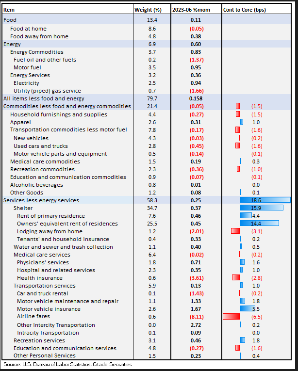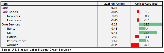 - Big decline in airfares at -8%, lowering the core print by 7bp.