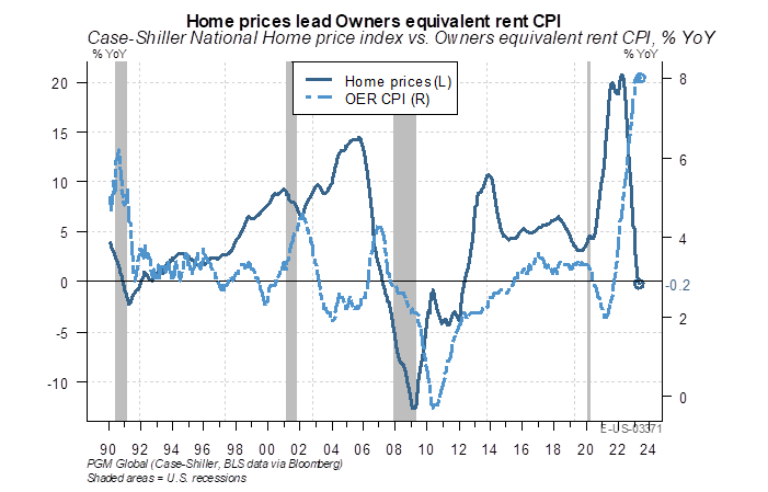 The battle with housing inflation will likely be one of the Fed’s longer-lasting inflation challenges. Home prices tend to lead owners’ equivalent rent (OER) by 18-24 months. Due to high mortgage rates in the U.S., we are seeing fewer existing home sales, which would have otherwise brought home prices and (eventually) rents lower.