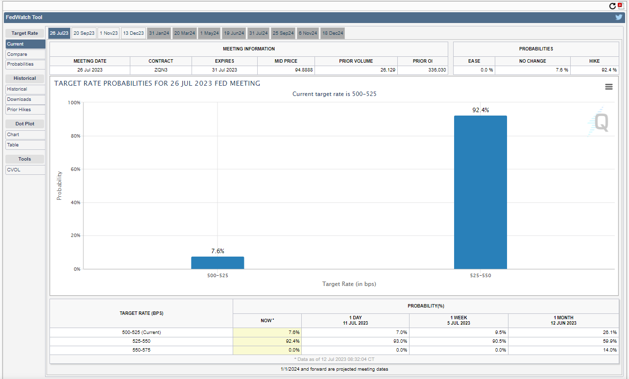Despite the lower-than-expected inflation print, another 25bps hike on July 26th looks near certain although the probability for additional hikes post July did fall.