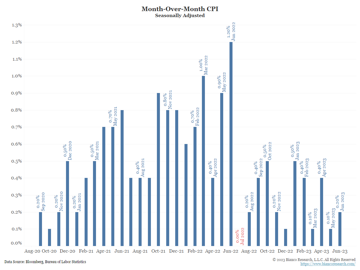 As shown above in the analysis from Bianco Research (and BAML), it is likely the June inflation print could be the local low in the inflation fight. While the Fed’s tightening of monetary policy has unarguably brought inflation lower the last 18 months, we must remember the “last mile” of the inflation anchoring marathon is typically the hardest. We believe the gusto of the Fed’s 2% target will likely be tested over the back half of 2023 and be a significant driver regarding what happens to risk assets.