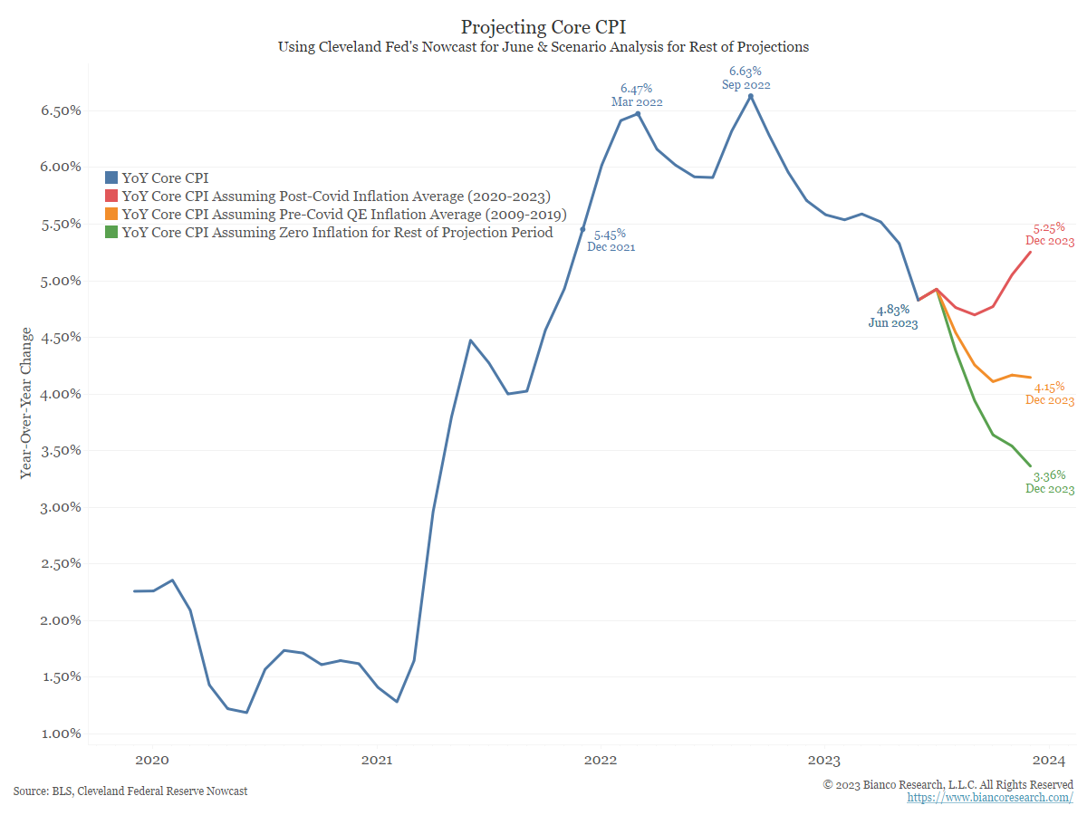 The red line shows Core CPI will hit 5.25% by December if inflation continues its post-Covid average. The orange line shows CPI would be 4.15% at the end of the year if the month-over-month releases equal pre-pandemic QE-era inflation. Finally, the green line shows CPI would be 3.36% by the end of 2023 if the month-over-month releases show 0% inflation between now and then.