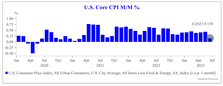Yields dropped and equities rose in response to the 3% Headline Inflation (and Core <5% for the first time since 2021) print as the market continues to see signs of immaculate disinflation (inflation down but growth okay/stable). Following the (likely) upcoming July hike, we believe the Fed will really look to the data as to whether they decide to continue hiking or simply hold rates at elevated levels for longer.