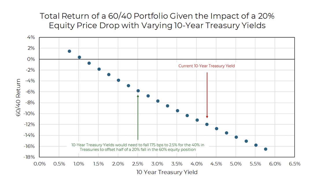 Consider a scenario where the 60% equity portion of the portfolio drops by 20%. This results in an overall portfolio decline of 12% (60% x -20% = -12%). To mitigate just half of this loss, the 40% in Treasuries would need to generate a return of 15% (40% x 15% = 6%). However, with the current 10-year Treasury yield around 4.25%, achieving such a return would require yields to plummet by 175 basis points (1.75%), down to approximately 2.5%.