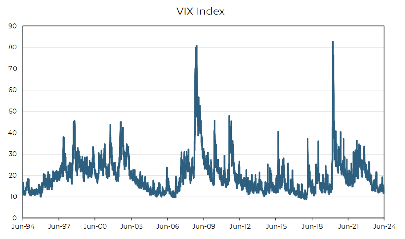 Puts can be particularly attractive when the cost of buying put options (i.e., the premium) is relatively low. This low cost reflects the market’s low expectations for volatility, as indicated by the VIX, which was recently at a historically low level of 12.5 (as of July 12, 2024). Low volatility expectations reduce the premium, making put options an economical choice for protection.