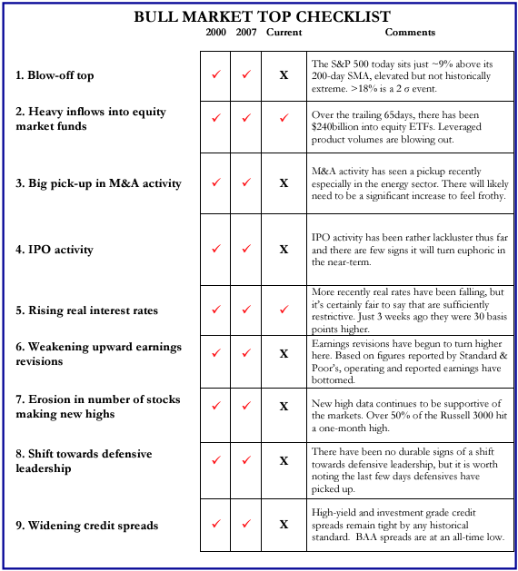 Brad: Despite the run, a checklist of common attributes of a market top shows very few are actually in place