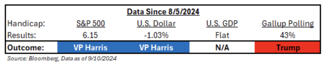 Tough shift to politics, but this is an investing blog and there are items to discuss. Let’s dig into our “Market Indicators” that have historically helped handicap the outcome: