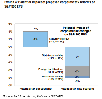 Goldman Sachs estimates that if the “domestic corporate tax rate declines from 21% to 15%, it would arithmetically boost S&P 500 earnings by about 4%. A tax hike scenario in which the rate rises to 28% would reduce earnings by about 5%. Combined with additional proposed changes to the taxation of foreign income and an increase in the alternative minimum tax rate from 15% to 21%, this scenario could reduce S&P 500 EPS by about 8%.”